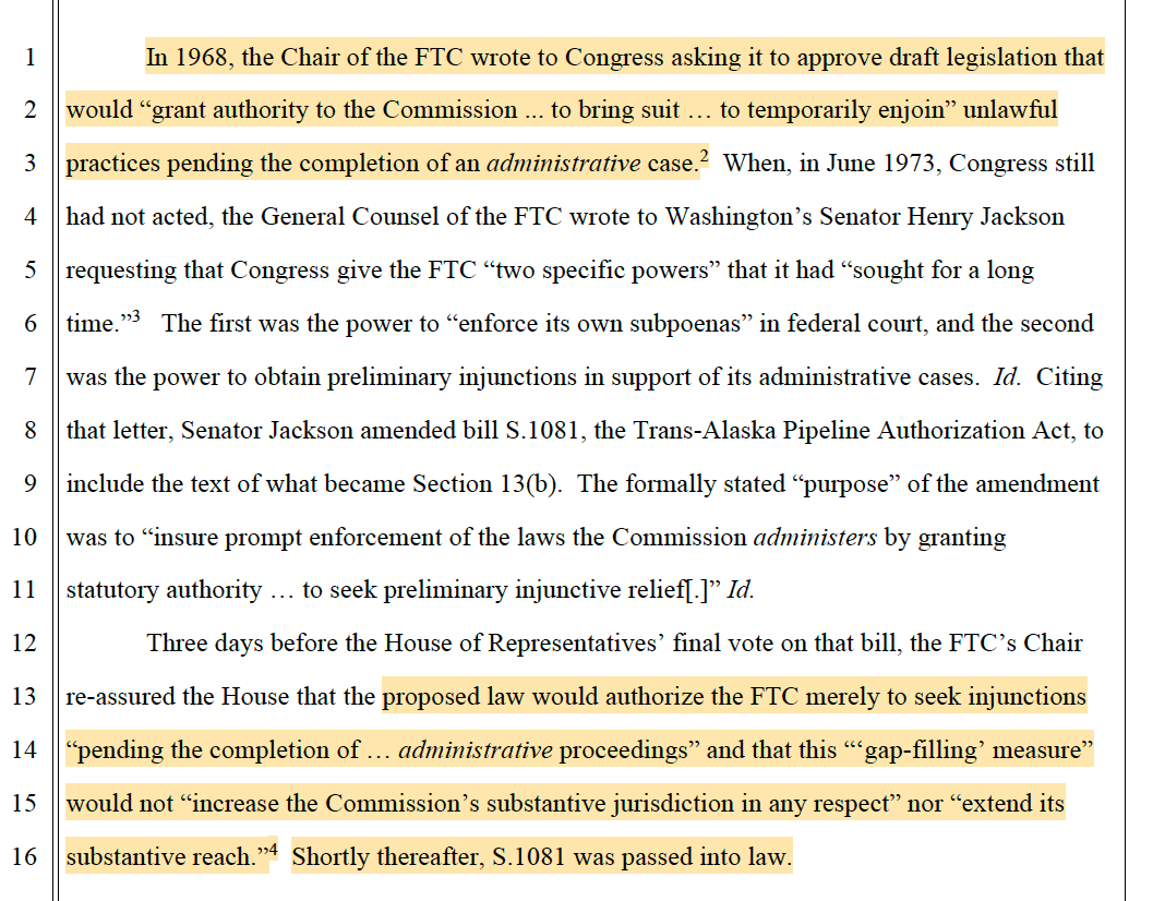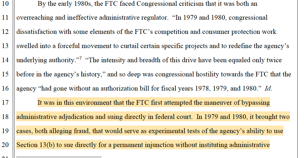 Things changed in the 1980s, when the FTC faced congressional criticism for overreach. In pursuit of "a more ambitious agenda", the FTC then decided to experiment with widening the scope of 13b to directly sue for a permanent injunction absent a pending administrative case.