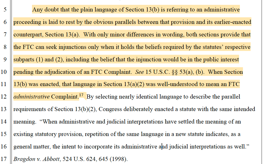 Amazon underscores the plain language of Section 13b, limiting interpretation to the FTC's ability to seek an injunction as an "incidental power" in support of an administrative case.