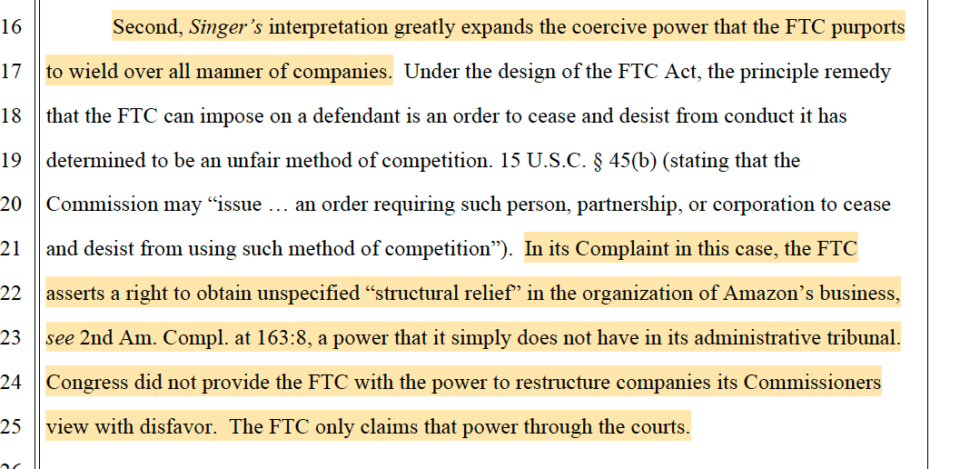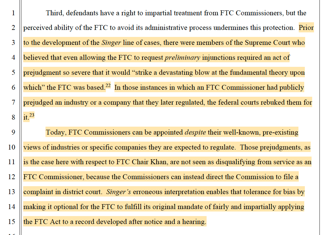 Lina Khan also got a call out. Amazon calls her out for bias, noting that courts typically rebuke FTC commissioners for pre-existing views on a company.