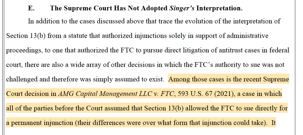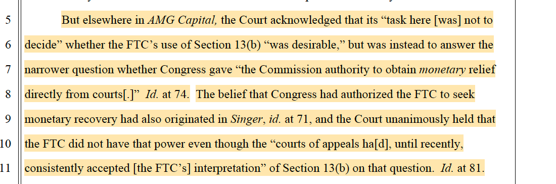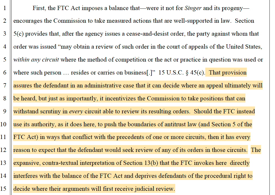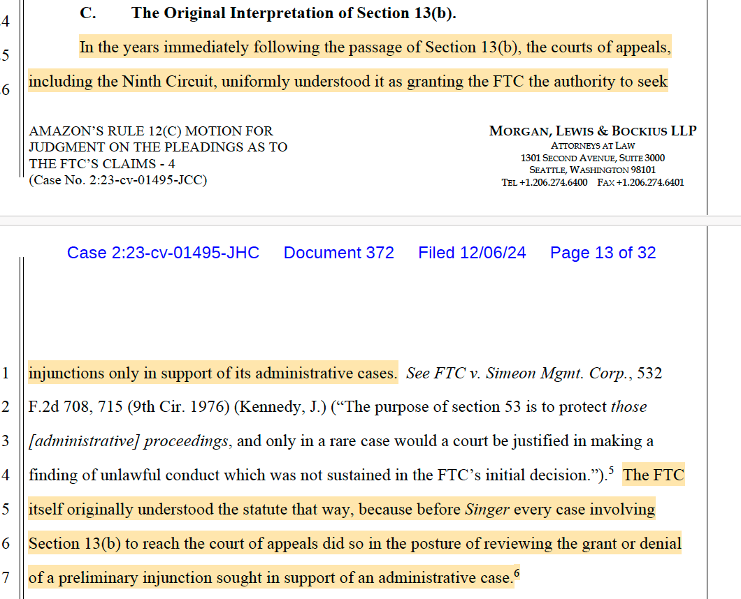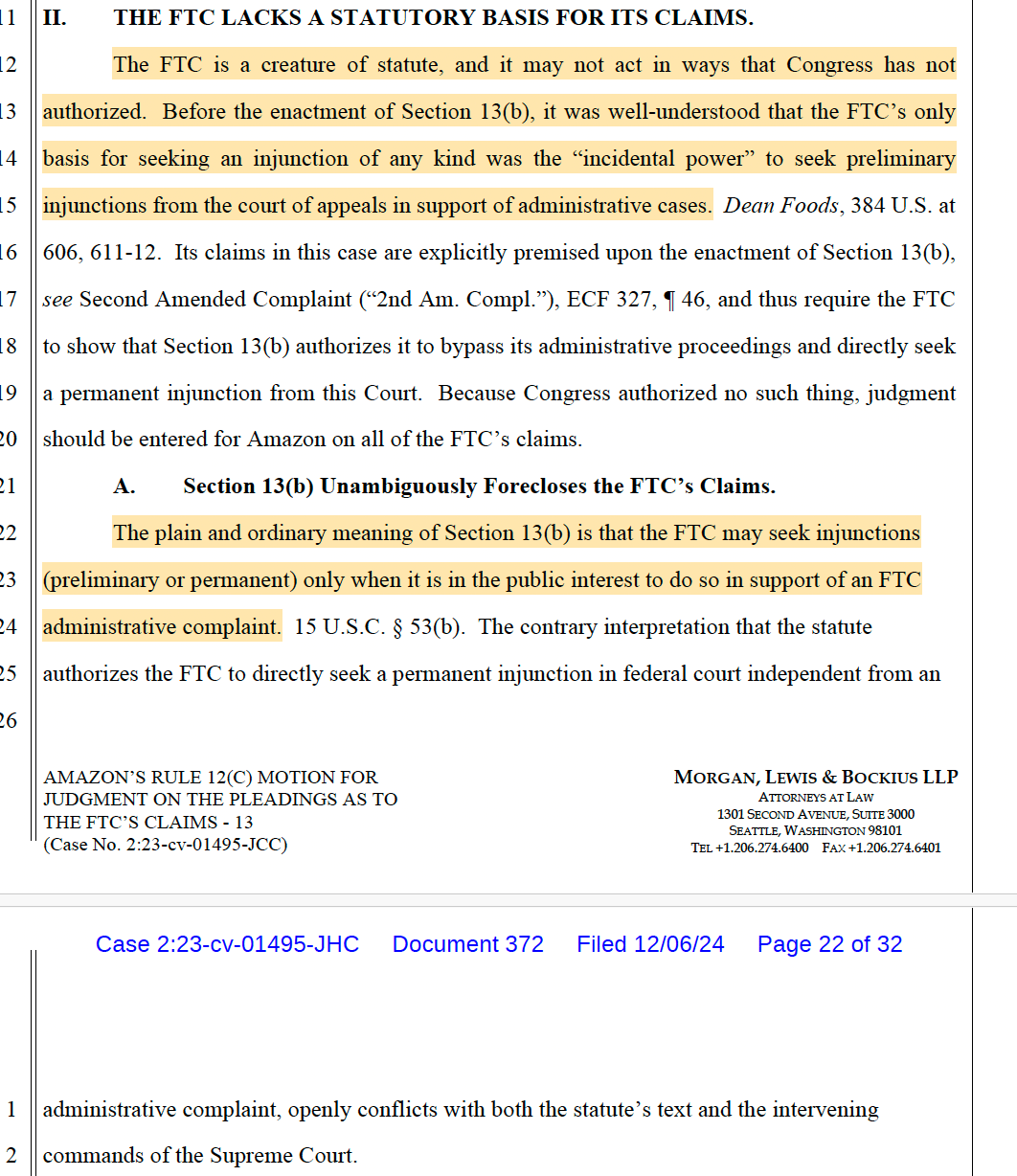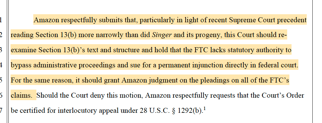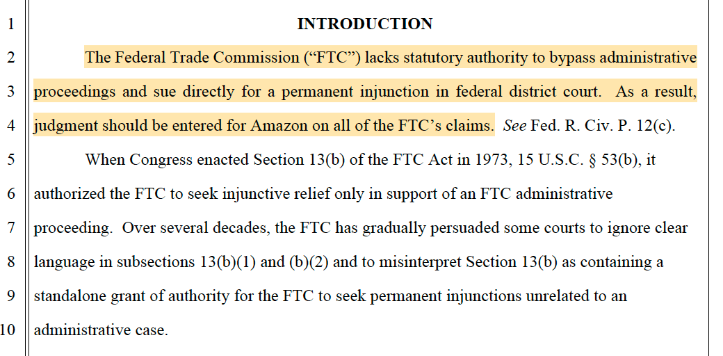 Amazon has filed a motion for a judgment on the pleadings in the case brought by the FTC because the FTC erroneously relies on Section 13b of the FTC Act to seek a permanent injunction absent bringing an administrative suit.