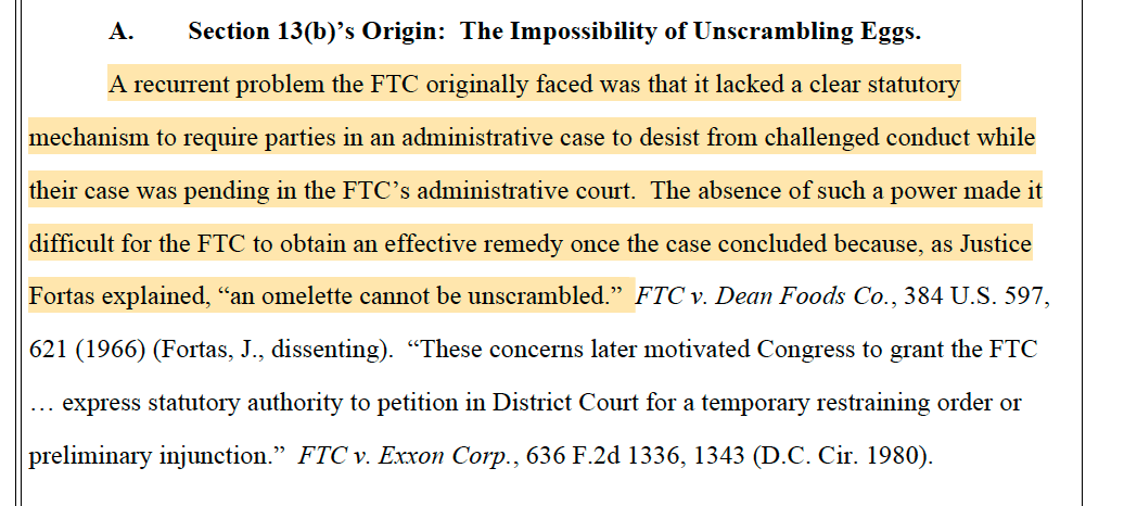 The FTC had an omelet issue, meaning harms it sought to stop would continue while it brought a case. This made crafting remedies akin to trying to unscramble eggs. This called for legislation allowing the FTC to *temporarily* enjoin conduct pending the completion of an administrative case.