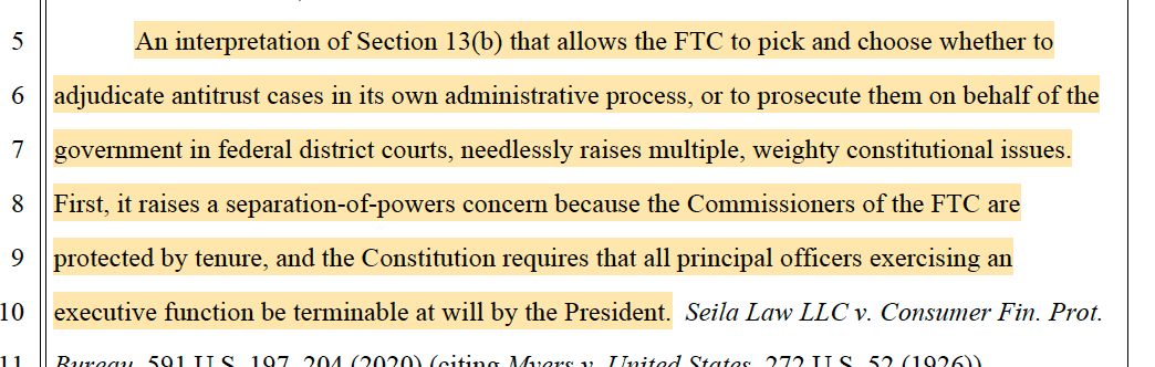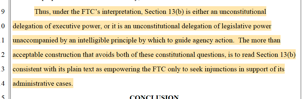 Finally, Amazon raises the constitutional issues that arise from the FTC's interpretation of 13b, namely that it creates a separation of powers problem.