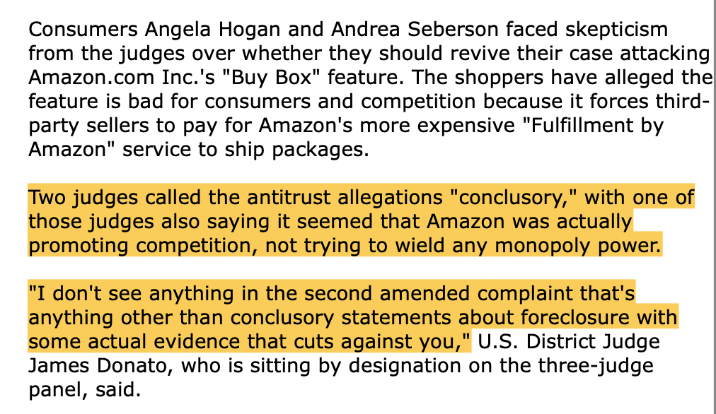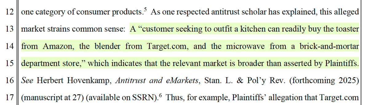 Judge Chun also referred to the Hovenkamp quote in AMZ’s brief that customer shopping habits don’t limit them to one retailer or even type of retailer- you can buy kitchen appliances at AMZ, Target.com, a brick and mortar store.