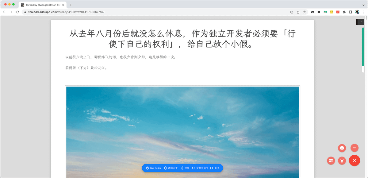 Threadreader A Text Renaissance 四杰之一,可以方便的将任意推文生成 HTML,比如在三亚游玩的时候,通过发推生成了我自己的「三亚游记」👉