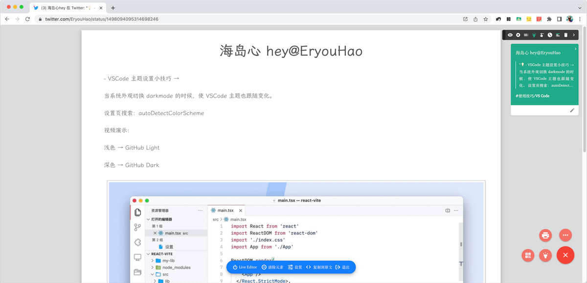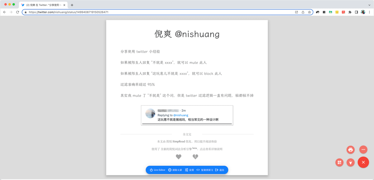 我通常的做法是将推文生成阅读模式,自然就接入了简悦的「豪华大礼包」。 以下是关于此方式的使用说明。