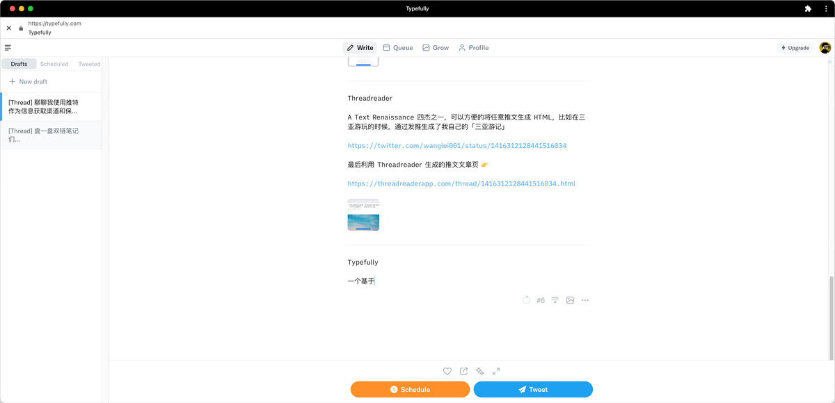 Typefully 一个基于推文的无压写作模式,我的很多文章(包括本篇),都是通过它写出来的,比如 👉