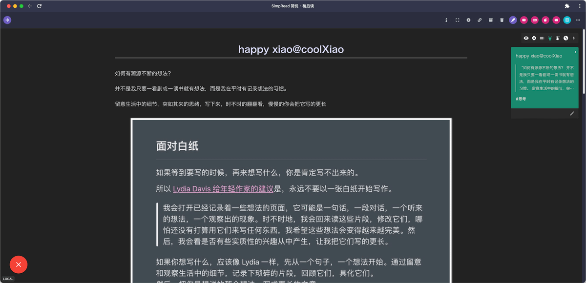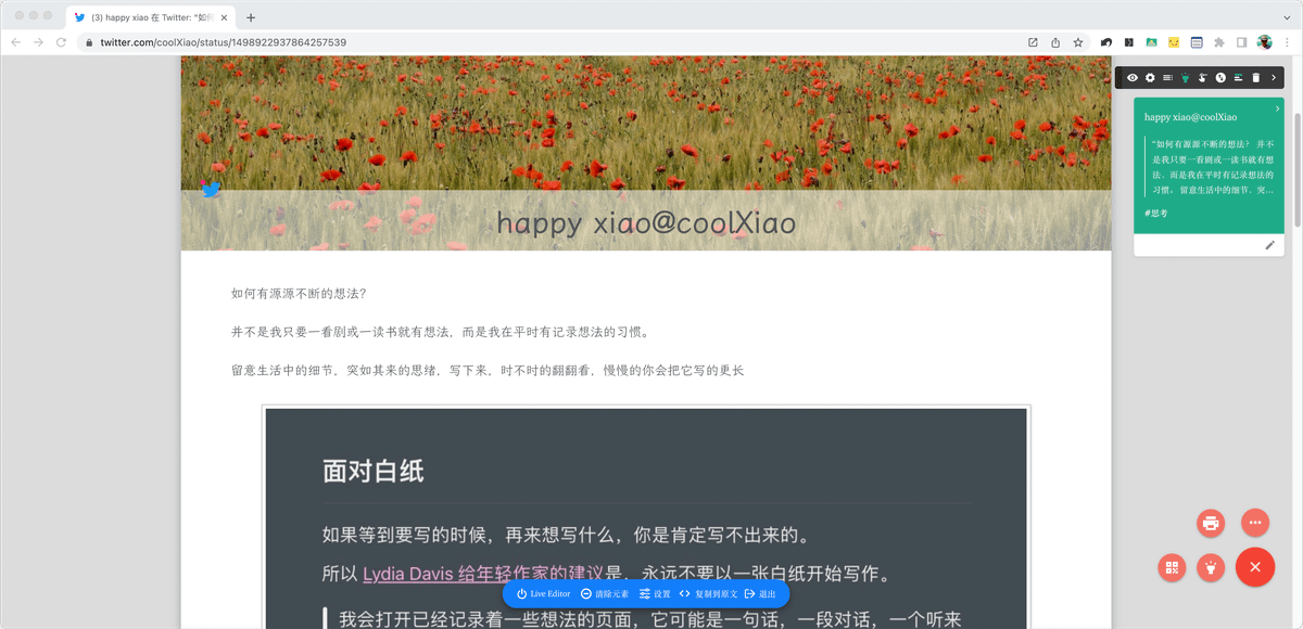 上面就是我使用简悦来适配推文页从而进行收藏整理的思路,我通过此方式记录了很多对我很有启发的内容。 因为推文的字数限制,大部分内容都是「浓缩的精华」,直接省去了标注的步骤。