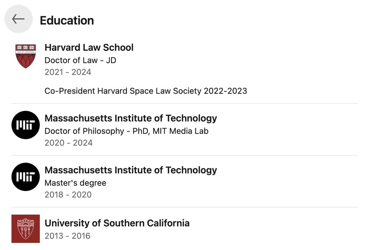 Obtuvo su licenciatura en la Universidad del Sur de California, una maestría y luego un doctorado en el MIT, más un doctorado en la Escuela de Leyes de Harvard.