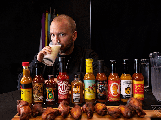 Hot Ones es un show de entrevistas donde el anfitrión, Sean Evans, invita a celebridades a comer 10 alas de pollo preparadas con diferentes salsas cada vez más picantes.