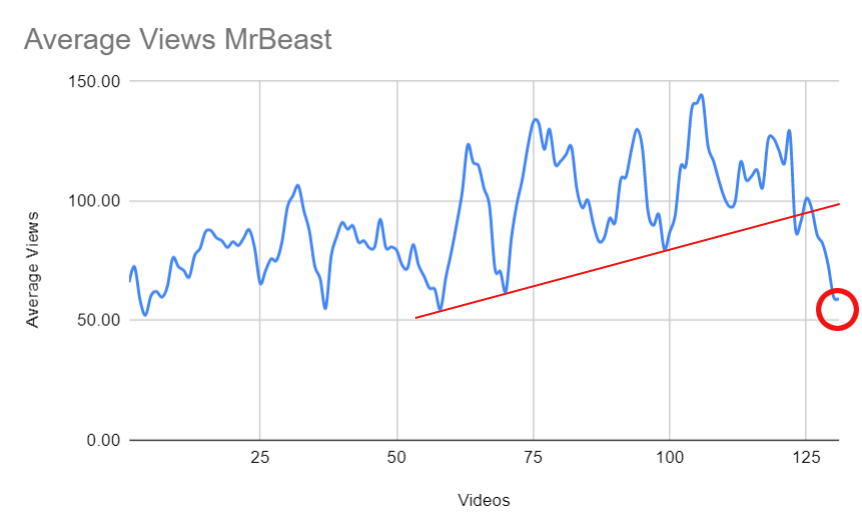 If he's not able to pull a banger within the next 10 videos you will start to see "MrBeast channel is dead" popping around.