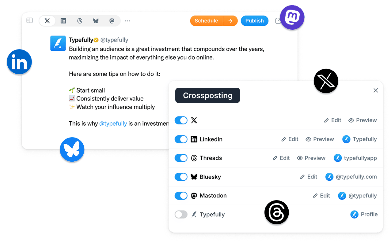 Discover how Typefully makes social media management effortless by letting you schedule content on X (Twitter) and across other major social media platforms from one intuitive and beautiful tool.