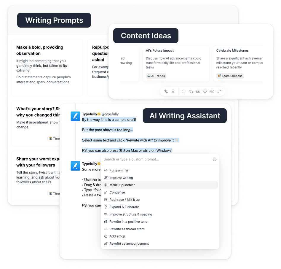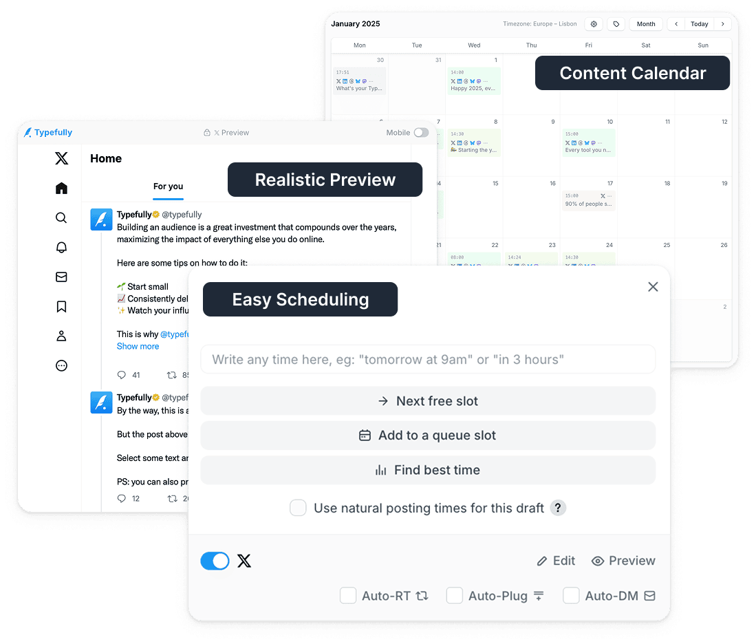 Typefully was built specifically for creating and scheduling X (Twitter) content. While it has evolved to support other platforms, all our features help you and your team grow on X (Twitter):