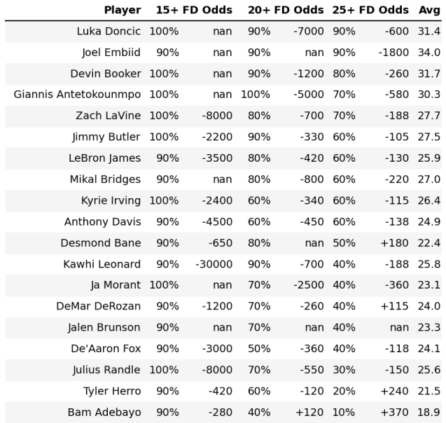 For instance, as seen above, Randle 15+ is 100% but the odds are -8000. But Doncic 25+ is 90%, but the odds are -600.