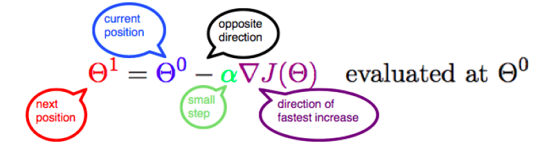 this diagram represents how parameter θ gets updated with the value of gradient in the opposite direction while taking small steps. this formula tells us our next position. in order to estimate the optimal parameter values, this process is repeated until convergence.