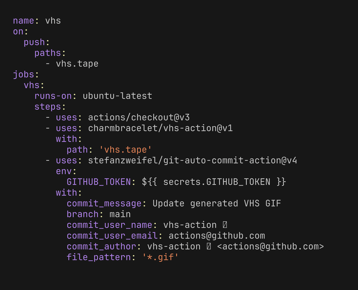 Here's a simple auto-commit example that shows how you can automatically re-generate and commit your VHS gif (or any other output type that VHS supports)